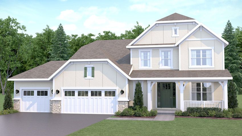Exterior rendering of a 2 story house, the Augusta floor plan. Craftsman