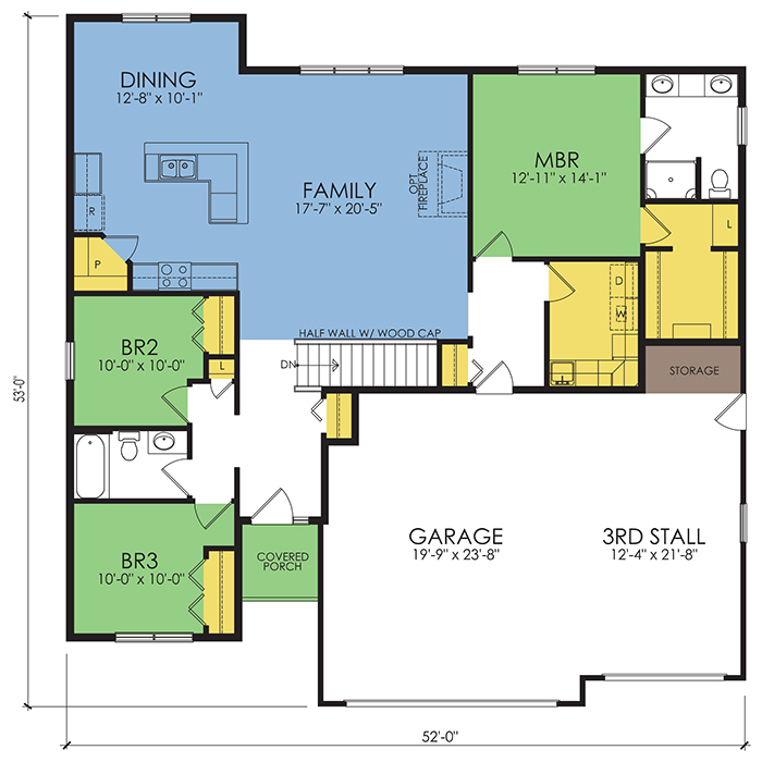 A part of our Wausau Originals, the Noelle floor plan features 3 bedrooms and 2 bathrooms with a foot print of 52x53 feet and 1656 total square feet of living space. Floor Plan #WO228